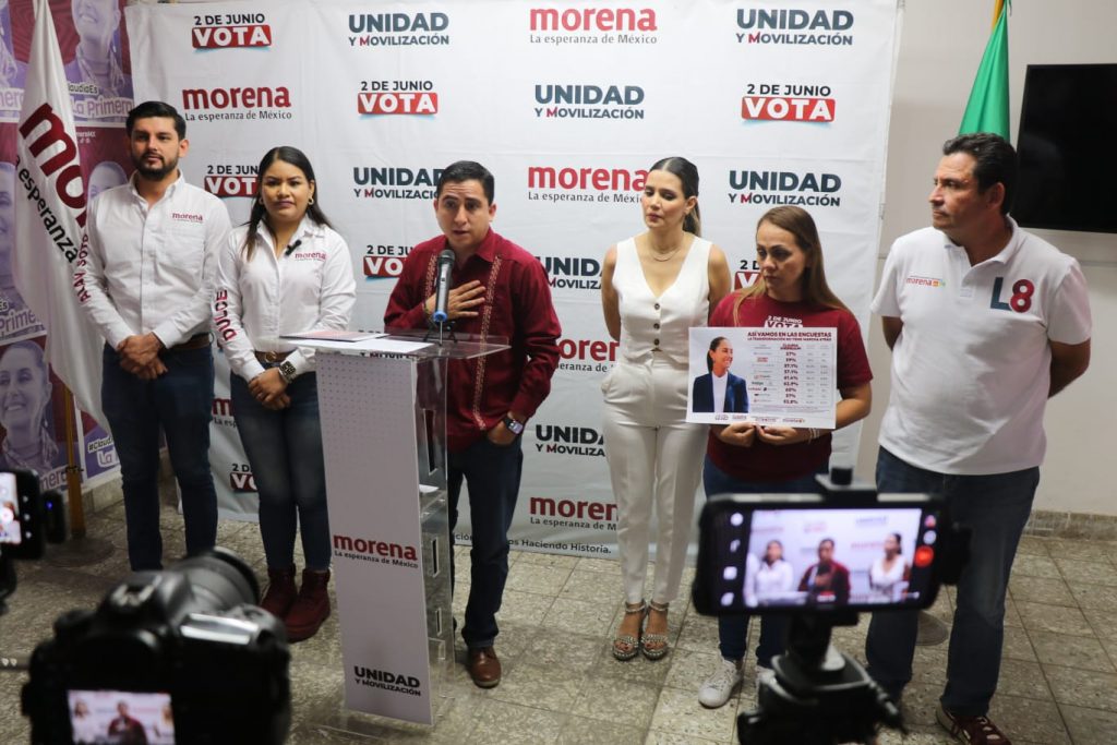 En rueda de prensa ofrecida esta mañana en el Comité Ejecutivo Estatal de Morena en Colima, dirigentes, referentes y candidaturas de este partido político sostuvieron que el triunfo de Claudia Sheinbaum este 2 de junio es inminente, ya que continúa encabezando todas las encuestas en proporción de 2 a 1 de su contrincante más cercana, con un crecimiento sostenido y manteniendo la confianza de todos los sectores de la población.