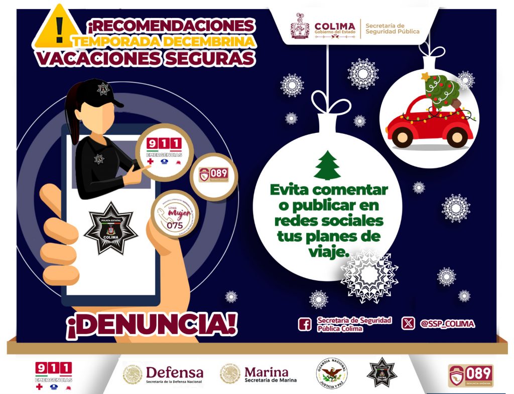 La Secretaría de Seguridad Pública (SSP) del Gobierno del Estado de Colima exhorta a la población no comentar ni publicar en redes sociales sus planes de viaje, como parte de las medidas preventivas durante esta temporada vacacional decembrina.