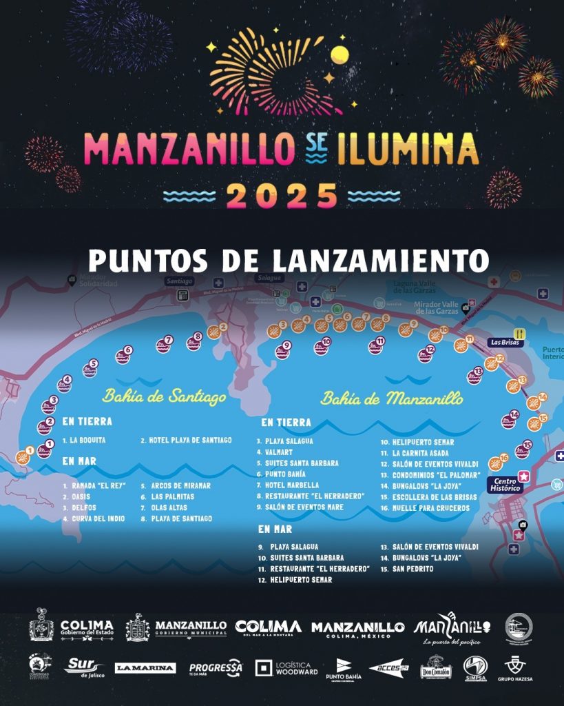 La celebración en el puerto contará con dos escenarios principales: en Playa Azul y en el Centro Histórico. El espectáculo de pirotecnia contará con 31 puntos de lanzamiento a lo largo de las dos bahías de Manzanillo, garantizando una amplia cobertura visual del espectáculo desde distintos puntos del puerto. En ambos escenarios habrá un espectáculo de drones a las 11:45 de la noche.
