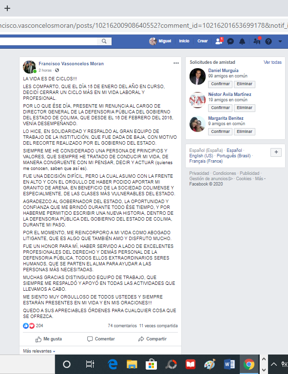 POR LO QUE ÉSE DÍA, PRESENTE MI RENUNCIA AL CARGO DE DIRECTOR GENERAL DE LA DEFENSORIA PÚBLICA DEL GOBIERNO DEL ESTADO DE COLIMA, QUE DESDE EL 16 DE FEBRERO DEL 2016, VENÍA DESEMPEÑANDO.