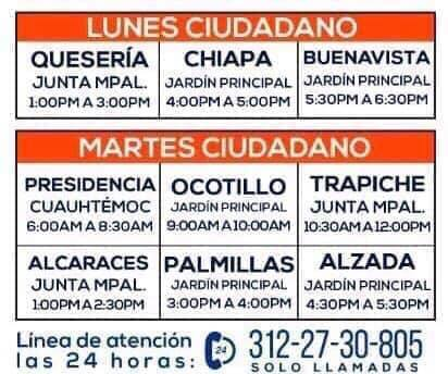 Los Lunes  atiende a la comunidad de Quesería, en la Junta Municipal, de 13:00 a 15:00 PM; en Chiapa de 16:00 a 17:00 PM, en el jardín principal; y en Buenavista de 17:30 a 18:30 PM, en el jardín principal.