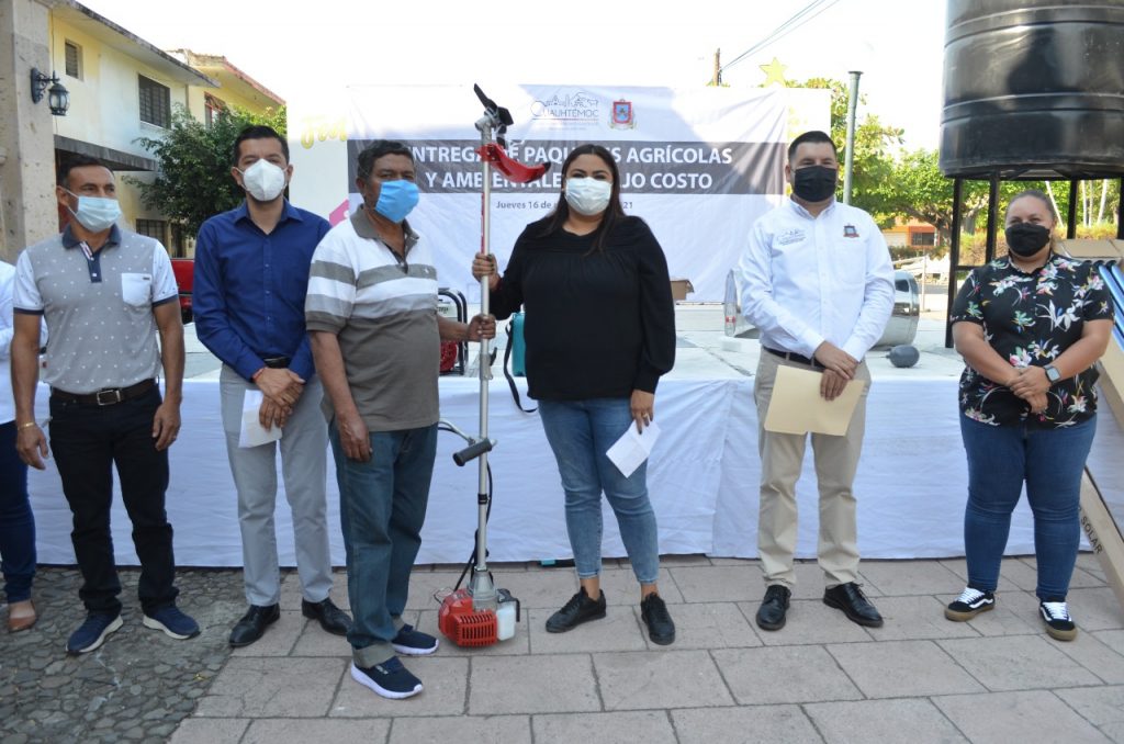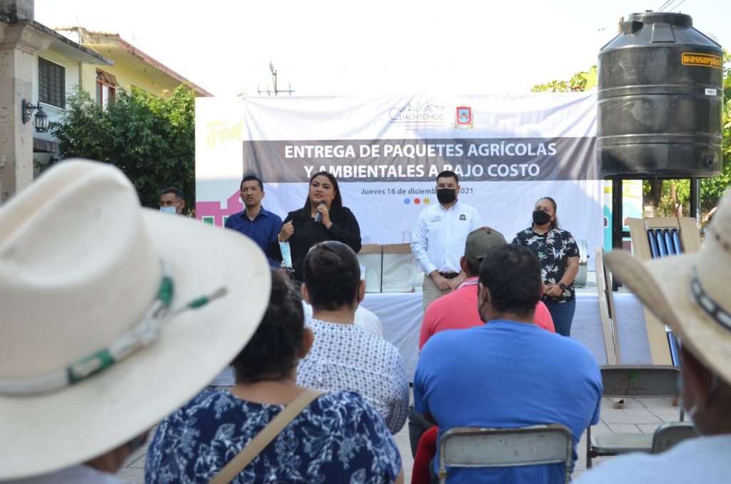 La presidenta municipal, Gabriela Mejía Martínez, encabezó el acto de entrega de paquetes agrícolas y ambientales a bajo costo, luego de las gestiones realizadas y la firma de convenio que permite brindar estos beneficios a las familias y agricultores del municipio.