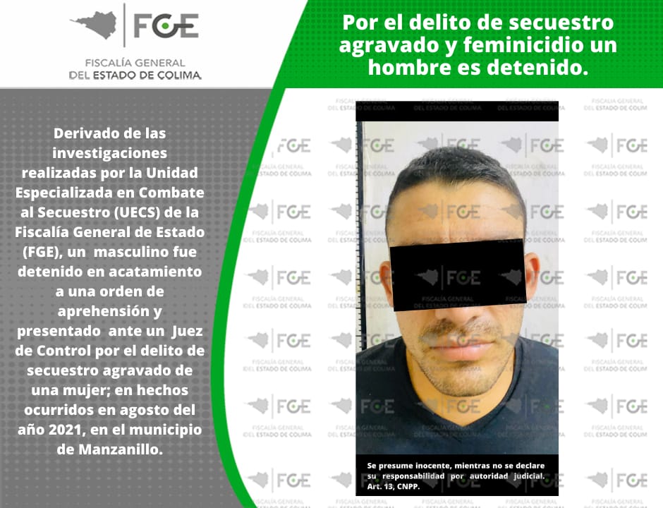 Derivado de las investigaciones realizadas por la Unidad Especializada en Combate al Secuestro (UECS) de la Fiscalía General de Estado (FGE), un masculino fue detenido en acatamiento a una orden de aprehensión y presentado ante un Juez de Control por el delito de secuestro agravado de una mujer; en hechos ocurridos en agosto del año 2021, en el municipio de Manzanillo.