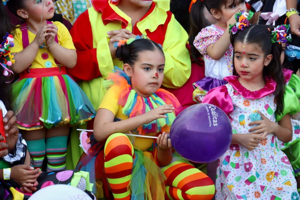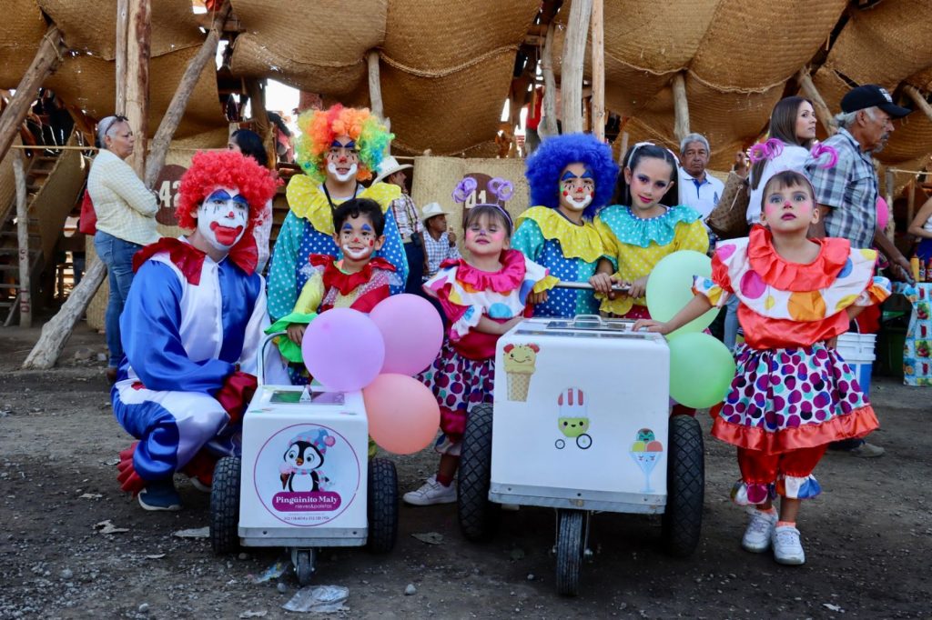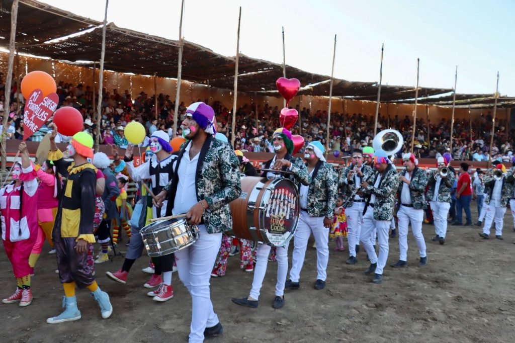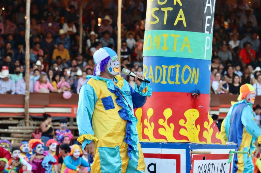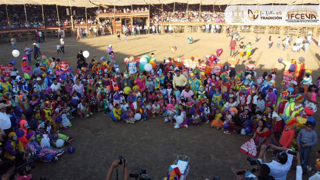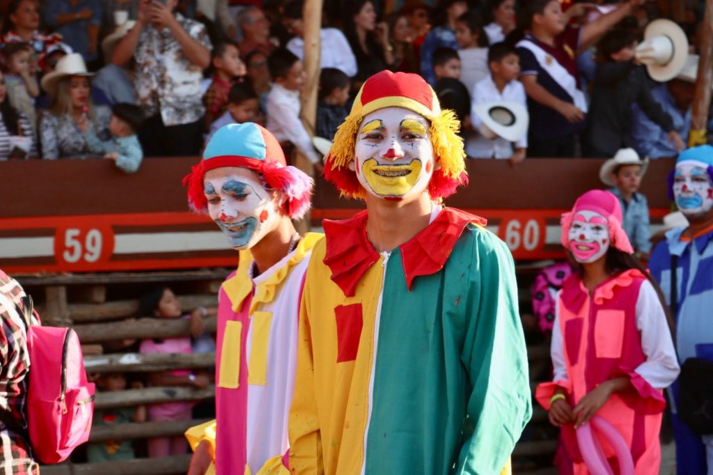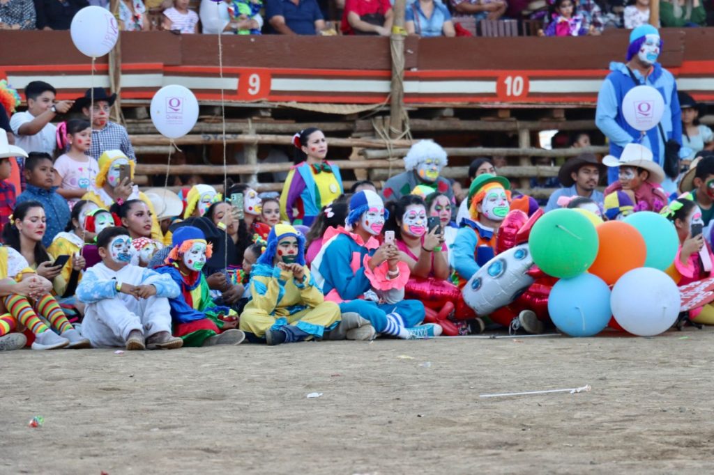 Villa de Álvarez, Colima. – Ante una plaza llena de familias, niños y adultos vestidos de payasos, se llevó a cabo la edición 99 de la tradicional Despedida del Payaso de los Festejos Charrotaurinos de Villa de Álvarez.