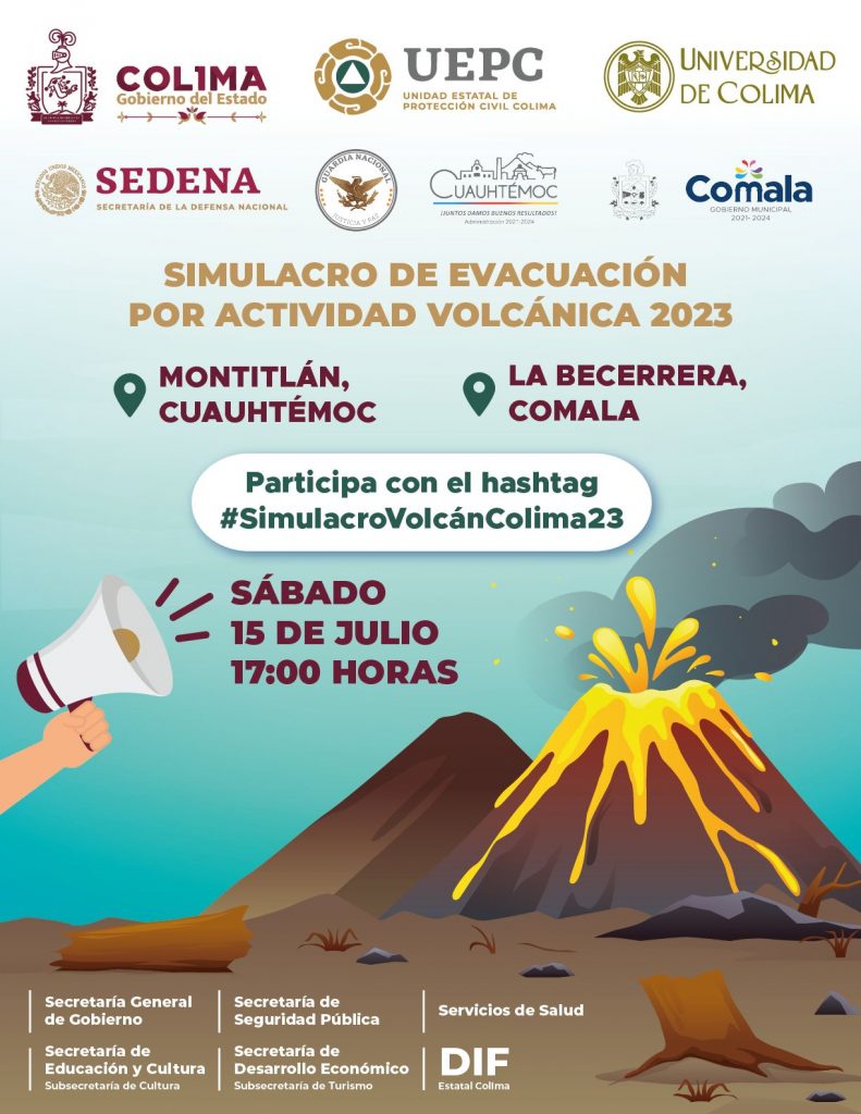 En rueda de prensa este lunes, el director de la Unidad Estatal de Protección Civil (UEPC) del Gobierno del Estado de Colima, Erick Alberto González Sánchez, y Guillermo de Jesús Navarrete Zamora, director general de Gobierno, dieron a conocer que este sábado 15 de julio a las 17 horas, en las comunidades de Montitlán (Cuauhtémoc) y La Becerrera (Comala), aledañas al Volcán de Fuego-, se realizará el primer simulacro de evacuación por actividad volcánica 2023.