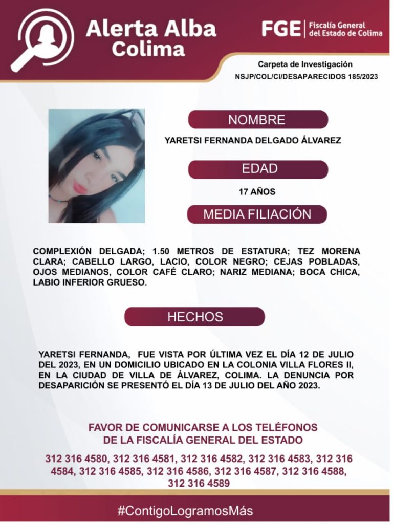 Favor de comunicarse a los teléfonos de la Fiscalía General del Estado. 312 316 45 83, 312 316 45 84, 312 316 45 85, 312 316 45 86, 312 316 45 87, 312 316 45 88, 312 316 45 89.