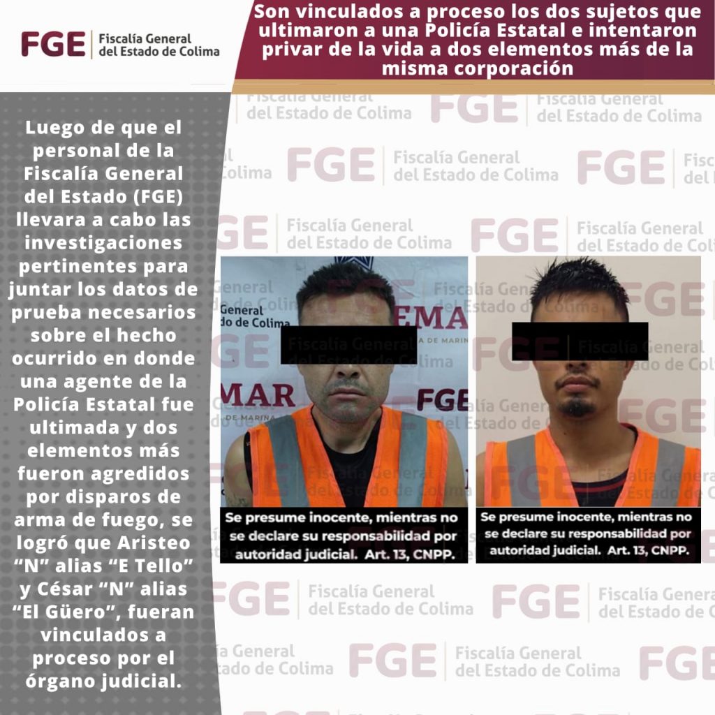 Luego de que el personal de la Fiscalía General del Estado (FGE) llevara a cabo las investigaciones pertinentes para juntar los datos de prueba necesarios sobre el hecho ocurrido en donde una agente de la Policía Estatal fue ultimada y dos elementos más fueron agredidos por disparos de arma de fuego, se logró que Aristeo “N” alias “E Tello” y César “N” alias “El Güero”, fueran vinculados a proceso por el órgano judicial.