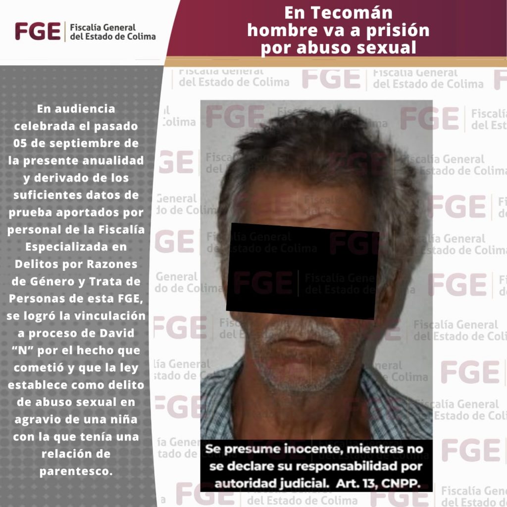 En audiencia celebrada el pasado 05 de septiembre de la presente anualidad y derivado de los suficientes datos de prueba aportados por personal de la Fiscalía Especializada en Delitos por Razones de Género y Trata de Personas de esta FGE, se logró la vinculación a proceso de David “N” por el hecho que cometió y que la ley establece como delito de abuso sexual en agravio de una niña con la que tenía una relación de parentesco.