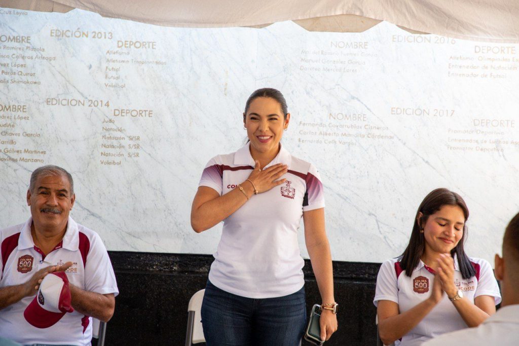Colima, Colima. 14 de octubre de 2023 .- La gobernadora Indira Vizcaíno Silva encabezó este sábado la ceremonia de develación de nombres que integran el Muro de Honor del Deporte Colimense, en el que añadió a los deportistas Javier Martínez Sánchez y Heriberto Medina Villafaña; reiteró el firme compromiso del Gobierno del Estado de Colima con el deporte y la cultura física, la responsabilidad de fomentar su práctica y brindar oportunidades para que las y los atletas talentosos de nuestra entidad puedan destacar.
