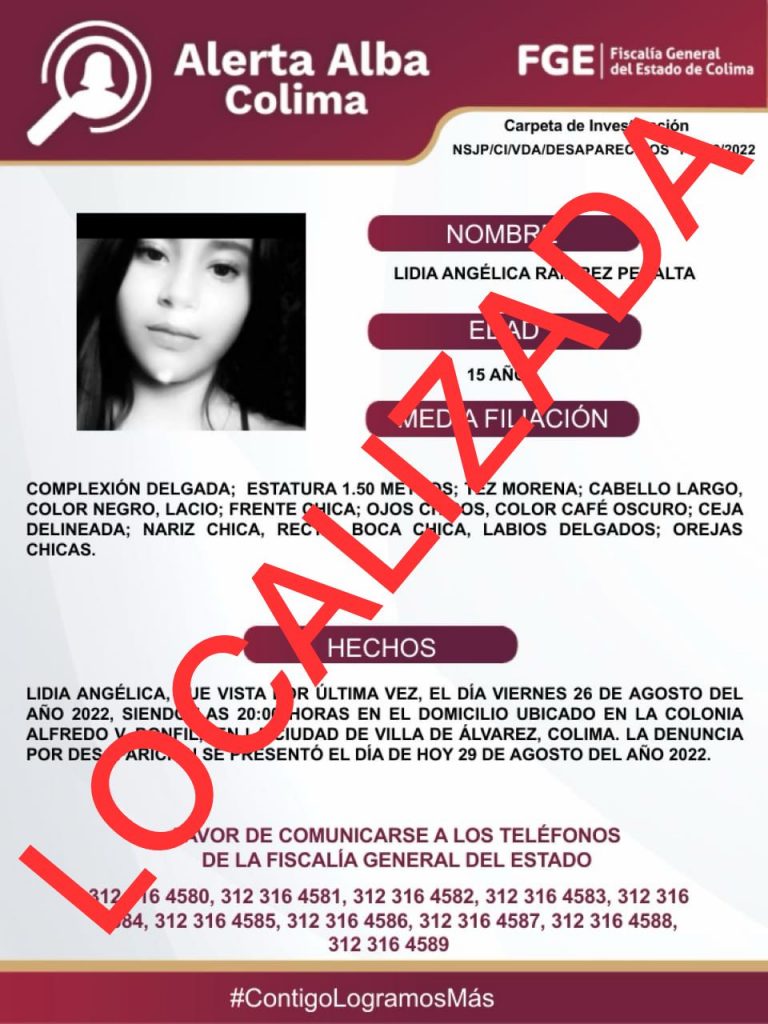 Lidia Angélica ya fue localizada. El Protocolo Alerta Alba agradece el apoyo de medios de comunicación y la colaboración de la sociedad mediante llamadas a las líneas 089 y 911, así como la información que se compartió a través de redes sociales.