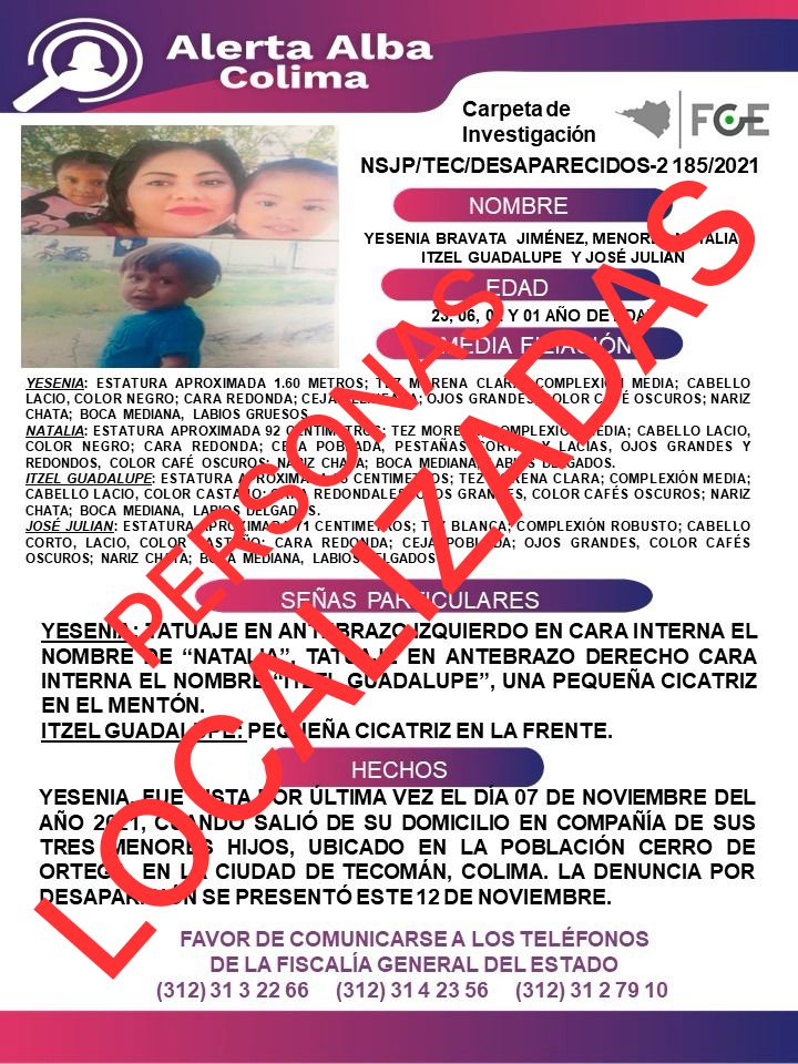 Yesenia y los menores Natalia, Itzel y José Julián ya fueron localizados. El Protocolo Alerta Alba agradece el apoyo de medios de comunicación y la colaboración de la sociedad mediante llamadas al 089 y 911, así como la información que se compartió a través de redes sociales.