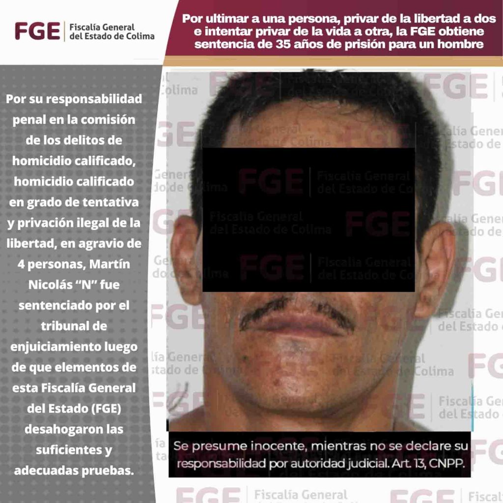 Por su responsabilidad penal en la comisión de los delitos de homicidio calificado, homicidio calificado en grado de tentativa y privación ilegal de la libertad, en agravio de 4 personas, Martín Nicolás “N” fue sentenciado por el tribunal de enjuiciamiento luego de que elementos de esta Fiscalía General del Estado (FGE) desahogaron las suficientes y adecuadas pruebas.