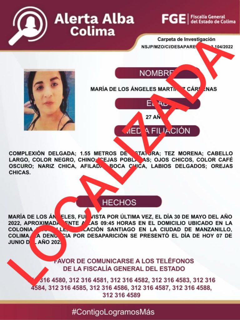 María de los Ángeles ya fue localizada. El Protocolo Alerta Alba agradece el apoyo de medios de comunicación y la colaboración de la sociedad mediante llamadas a las líneas 089 y 911, así como la información que se compartió a través de redes sociales