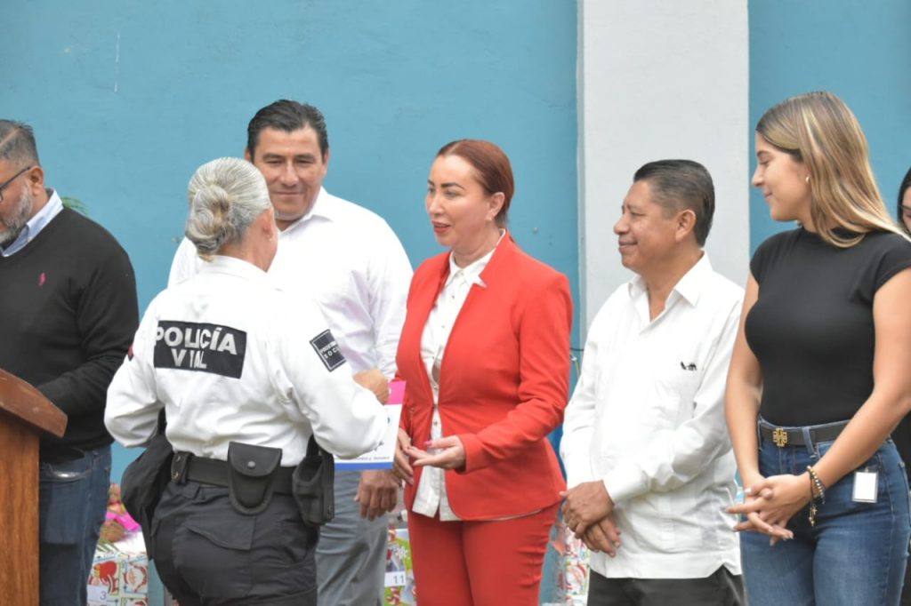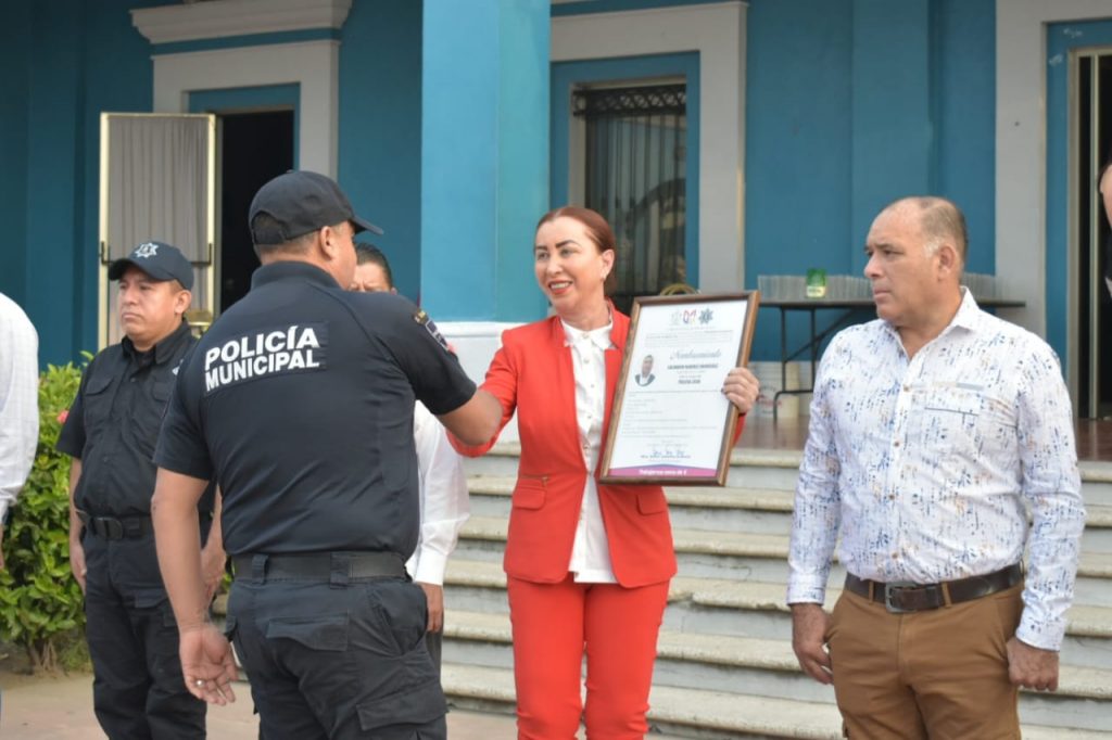 Además la Presidenta Municipal entregó a 19 agentes de seguridad pública y vialidad documentos por corrimiento de la modalidad de contrato a personal de confianza y ascenso por cambio de grado a nueve policías: cinco de Policía a Policía Tercero, tres de Policía Tercero a Policía Segundo y uno de Policía Segundo a Policía Primero.