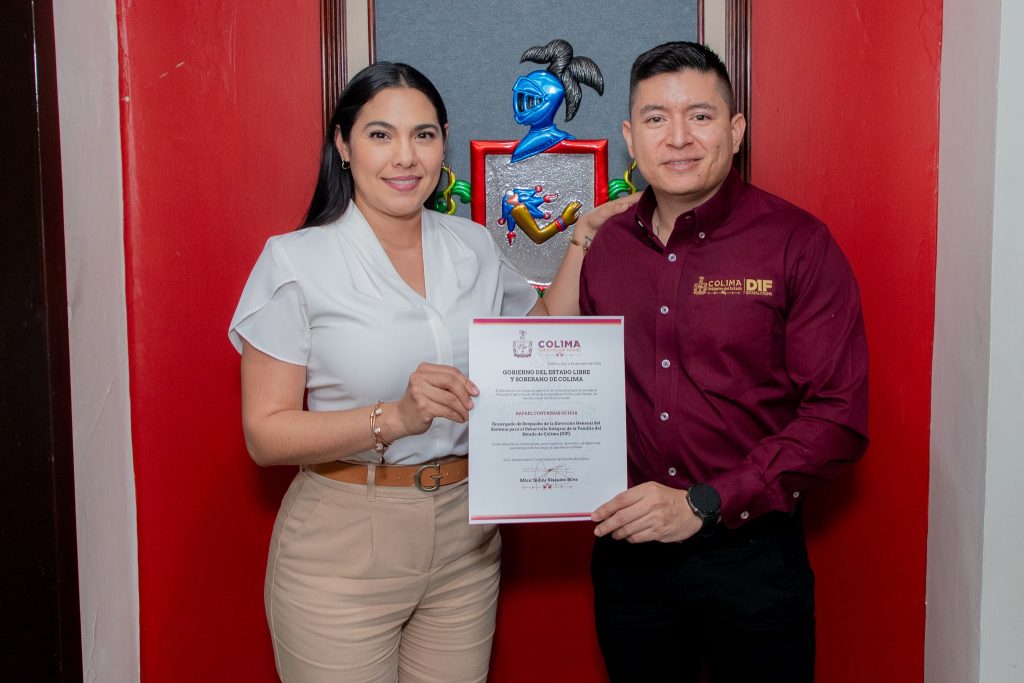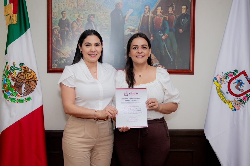 Colima, Colima.  24 de enero de 2024 .- La tarde de este miércoles, la gobernadora de Colima, Indira Vizcaíno Silva, entregó nombramientos a Blanca Livier Rodríguez Osorio como secretaria ejecutiva del Sistema de Protección Integral de los Derechos de las Niñas, Niños y Adolescentes (Sipinna) del Estado de Colima y a Rafael Contreras Ochoa como encargado del Despacho de la Dirección General del DIF Estatal, en sustitución de Rosi Bayardo Cabrera.