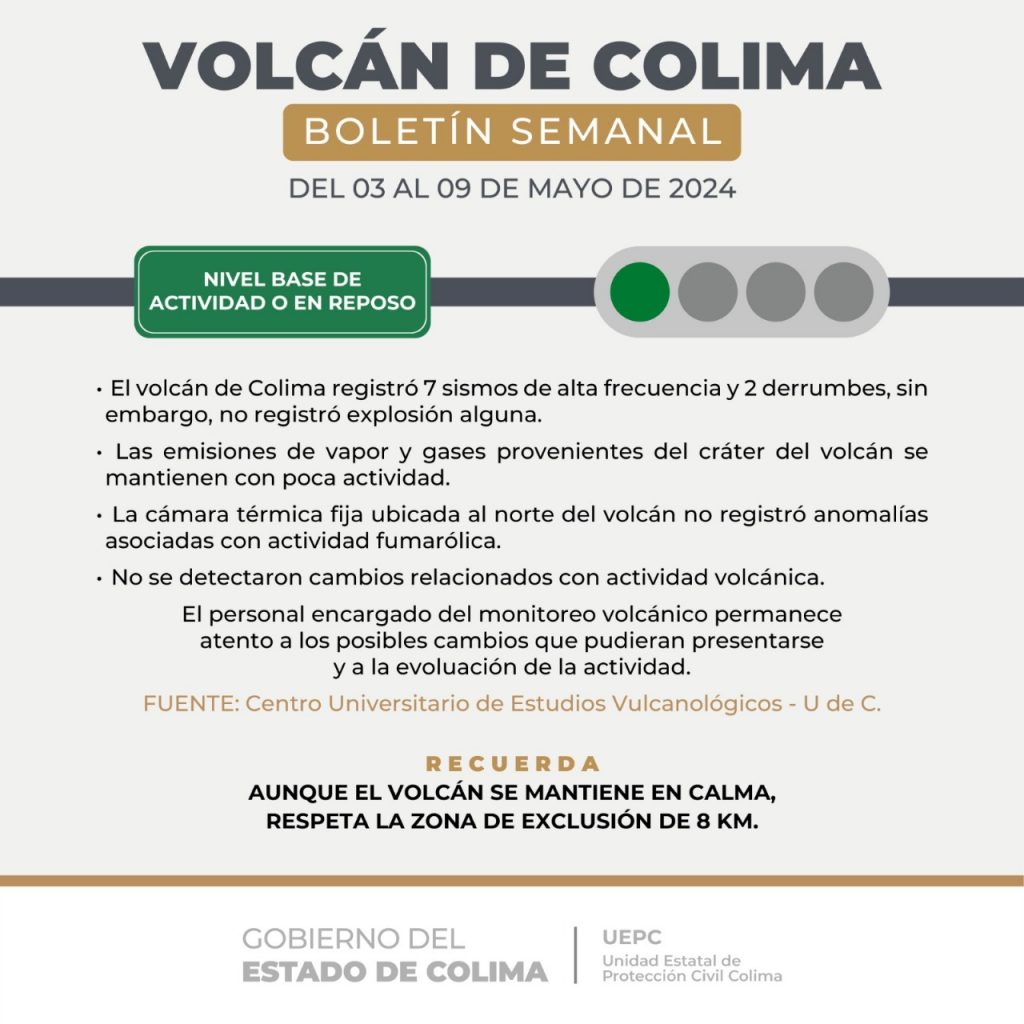 Colima, Col. 10 de mayo de 2024 .- La Unidad Estatal de Protección Civil (UEPC) dio a conocer que el Volcán de Fuego de Colima sigue con nivel de actividad base y durante la semana más reciente registró siete sismos, por lo que el Coloso de Fuego aún permanece en semáforo verde.