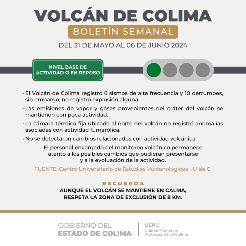 7 de junio 2024.- La Unidad Estatal de Protección Civil (UEPC) del Gobierno del Estado de Colima dio a conocer que el Volcán de Fuego de Colima continúa en semáforo verde y los diversos parámetros de monitoreo indican que se encuentra en calma.