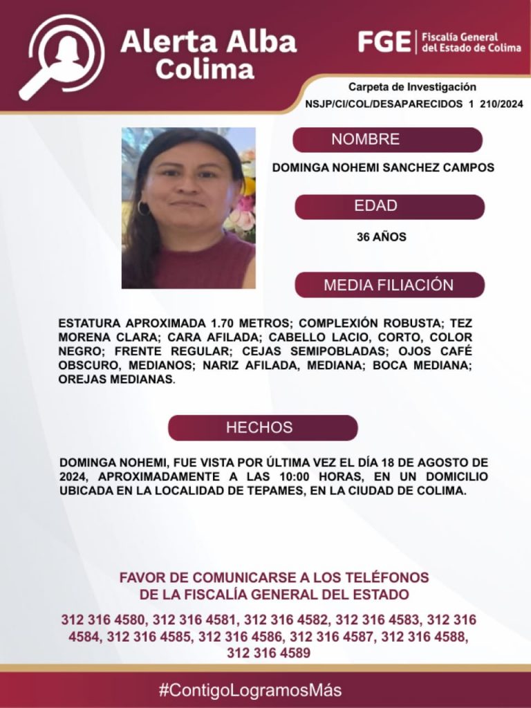 Favor de comunicarse a los teléfonos de la Fiscalía General del Estado. 312 316 45 80, 312 316 45 81, 312 316 45 82, 312 316 45 83, 312 316 45 84, 312 316 45 85, 312 316 45 86, 312 316 45 87, 312 316 45 88, 312 316 45 89.
