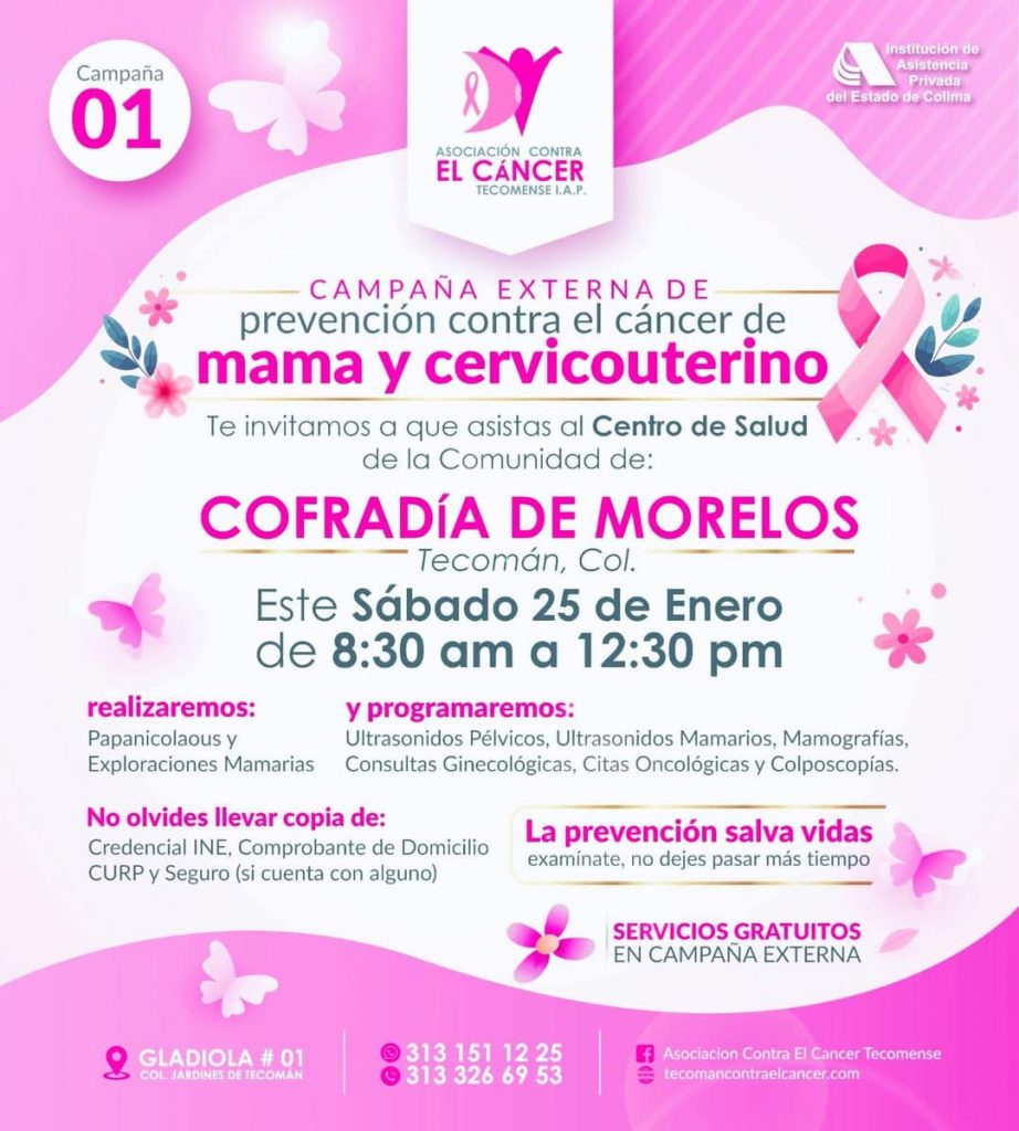 Este sábado 25 de enero, a partir de las 8:30 de la mañana y hasta las 12:30 del día, la asociación contra el cáncer Tecomense realizará la primera campaña de prevención contra el cáncer de mama y cérvico-uterino, en el Centro de Salud de la comunidad de Cofradía de Morelos.