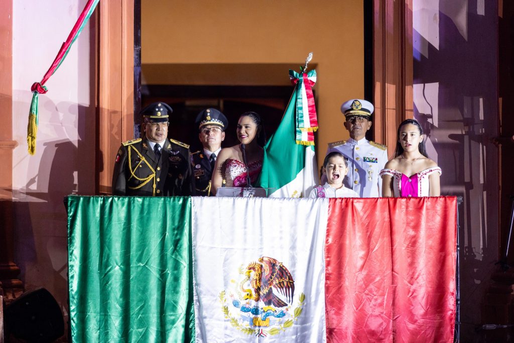 Tras la arenga, la titular del Poder Ejecutivo estatal resonó la campana de Palacio, ondeó el lábaro patrio y junto a las demás autoridades presentes y las y los asistentes entonaron el Himno Nacional, para finalmente entregar la Bandera a la escolta, acto que dio paso al espectáculo de pirotecnia.