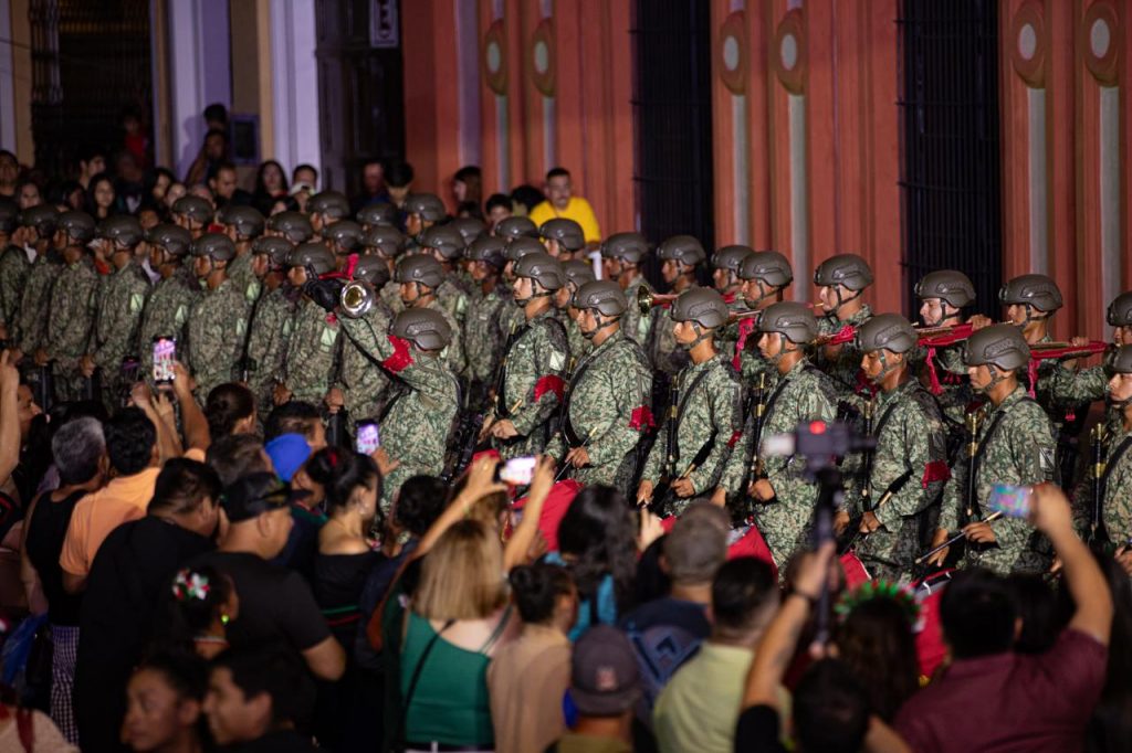 Tras la arenga, la titular del Poder Ejecutivo estatal resonó la campana de Palacio, ondeó el lábaro patrio y junto a las demás autoridades presentes y las y los asistentes entonaron el Himno Nacional, para finalmente entregar la Bandera a la escolta, acto que dio paso al espectáculo de pirotecnia.