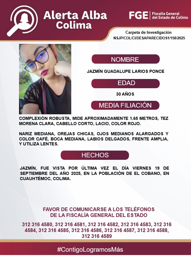 Favor de comunicarse a los teléfonos de la Fiscalía General del Estado. 312 316 45 80, 312 316 45 81, 312 316 45 82, 312 316 45 83, 312 316 45 84, 312 316 45 85, 312 316 45 86, 312 316 45 87, 312 316 45 88, 312 316 45 89