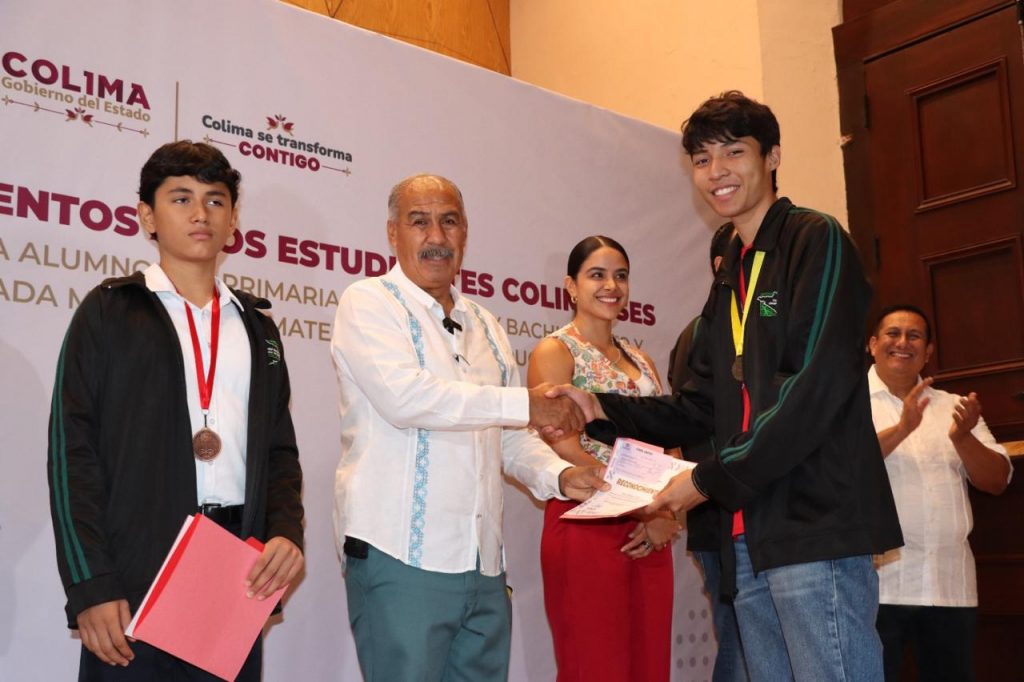 El Gobierno del Estado de Colima que encabeza la mandataria Indira Vizcaíno Silva, a través de la Secretaría de Educación y Cultura, entregó reconocimientos a estudiantes colimenses destacados que participaron en la XXV Olimpiada Nacional para alumnos de primaria, secundaria y bachillerato, realizada en abril y mayo en Cholula Puebla y en el 9° Concurso Nacional de la Olimpiada Mexicana de Matemáticas para Educación Básica, en Oaxtepec, Morelos, en septiembre pasado.