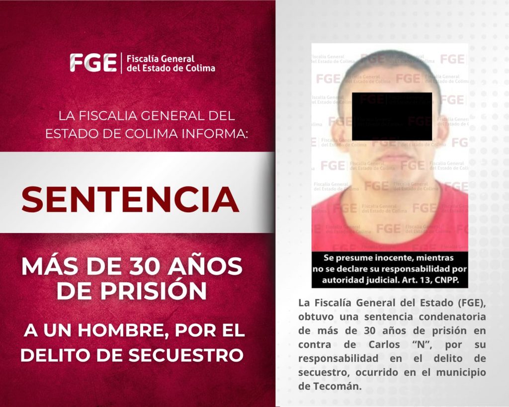 La Fiscalía General del Estado (FGE), obtuvo una sentencia condenatoria de más de 30 años de prisión en contra de Carlos “N”, por su responsabilidad en el delito de secuestro, ocurrido en el municipio de Tecomán.