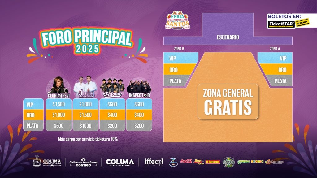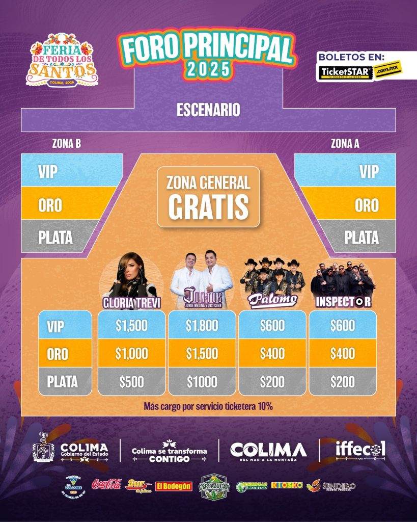 El Foro Principal de la Feria de Todos los Santos Colima 2025 nuevamente contará con zona preferente, que estará ubicada a los costados de esta explanada, donde el Gobierno del Estado de Colima ofrecerá cinco conciertos masivos gratuitos.