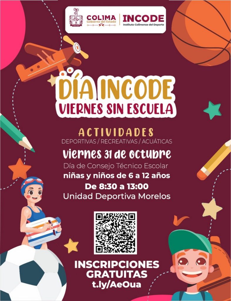 El Gobierno del Estado de Colima, a través del Instituto Colimense del Deporte, invita al ‘Día Incode, viernes sin escuela’, donde ofrecerán de manera gratuita actividades deportivas, recreativas y acuáticas, el próximo viernes 31 de octubre, día del Consejo Técnico Escolar (CTE) para niñas y niños de seis a doce años, en la unidad deportiva ‘José María Morelos y Pavón’, desde las 8:30 de la mañana hasta la una de la tarde.