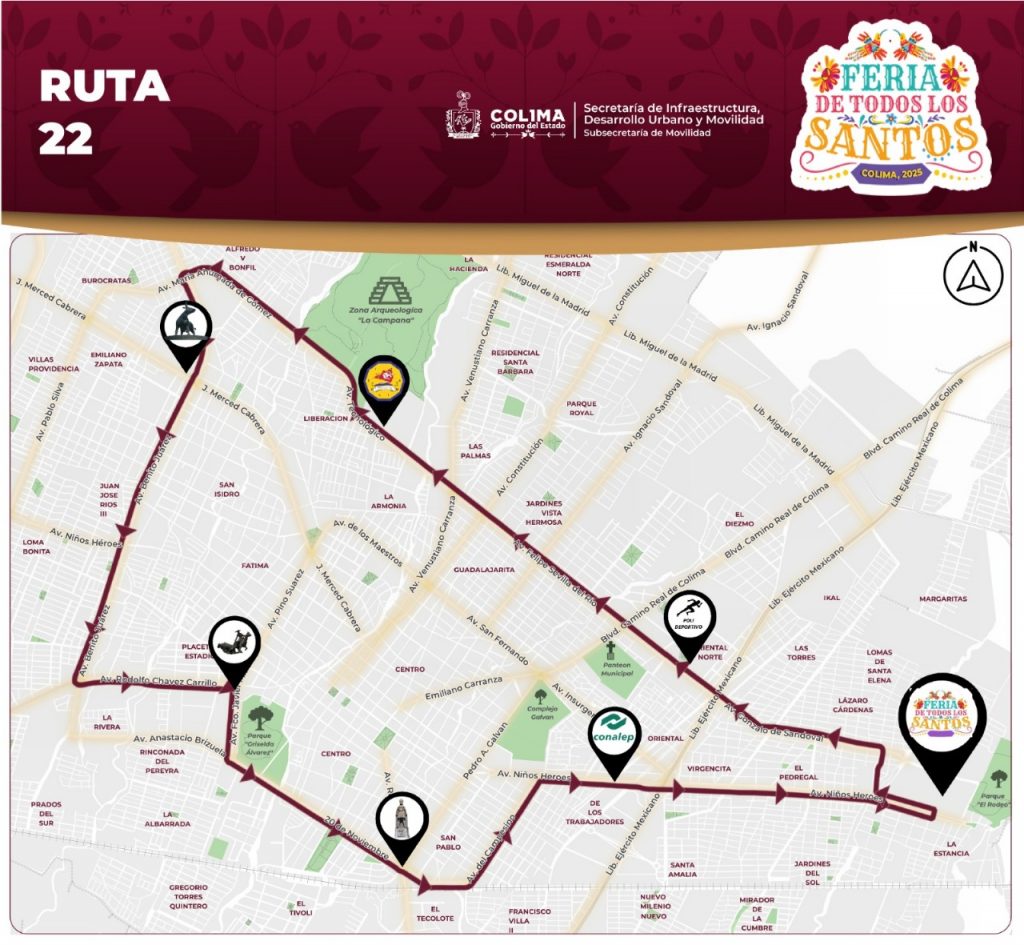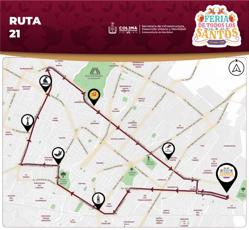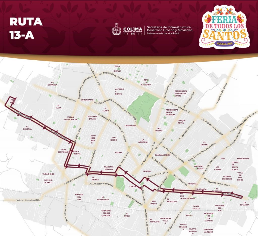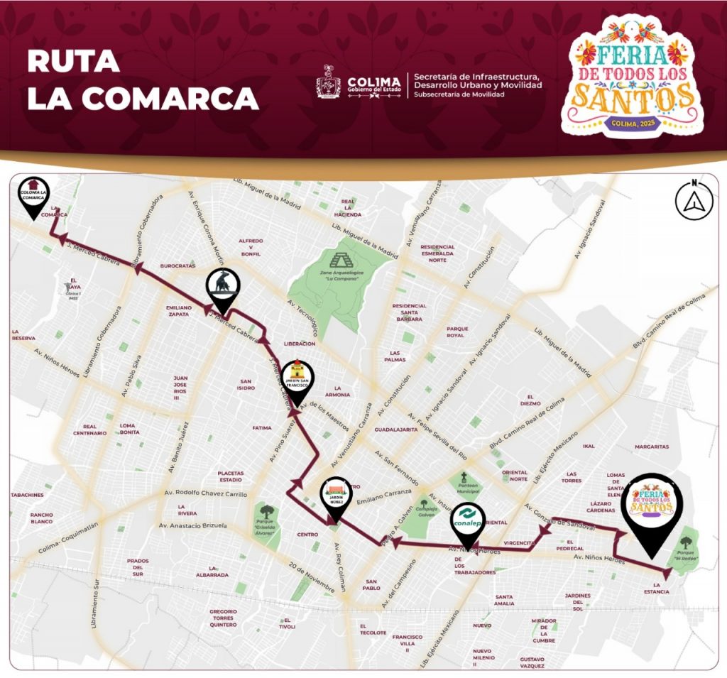 El Gobierno del Estado de Colima, a través de la Subsecretaría de Movilidad (Subsemov), informa la implementación del Plan Operativo ‘Feria de Todos los Santos 2025’, que tiene como objetivo garantizar traslados seguros, eficientes y ordenados del 31 de octubre al 17 de noviembre que dura el máximo festejo anual, mediante la coordinación de rutas de transporte público, zonas de ascenso y descenso, y carriles preferenciales para el transporte autorizado.