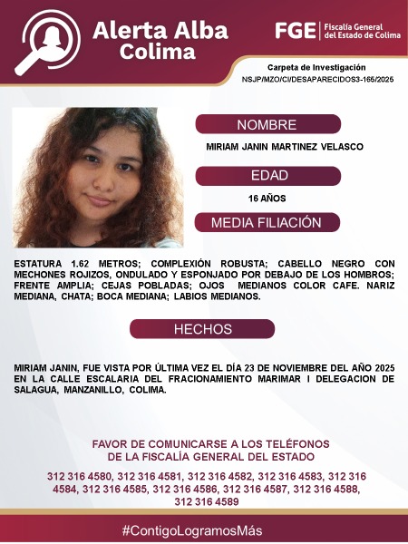 Favor de comunicarse a los teléfonos de la Fiscalía General del Estado. 312 316 45 80, 312 316 45 81, 312 316 45 82, 312 316 45 83, 312 316 45 84, 312 316 45 85, 312 316 45 86, 312 316 45 87, 312 316 45 88, 312 316 45 89.