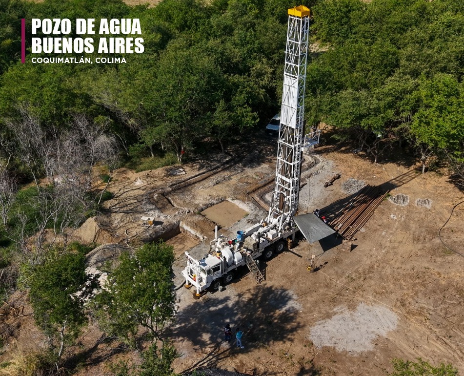 De igual forma, en el municipio de Coquimatlán se realiza la perforación, aforo, así como el equipamiento y construcción de la caseta de desinfección, tanque elevado y protección del pozo profundo ‘Buenos Aires’, con un avance de 30% y un impacto directo en más de 2 mil personas beneficiarios de la zona.
