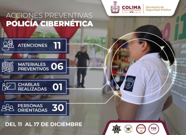 La Secretaría de Seguridad Pública (SSP) del Gobierno del Estado de Colima informa que, durante esta semana, la Policía Cibernética brindó once atenciones especializadas relacionadas con posibles delitos cometidos a través de medios digitales, con el objetivo de prevenir riesgos y proteger a la población colimense frente a conductas ilícitas en internet.