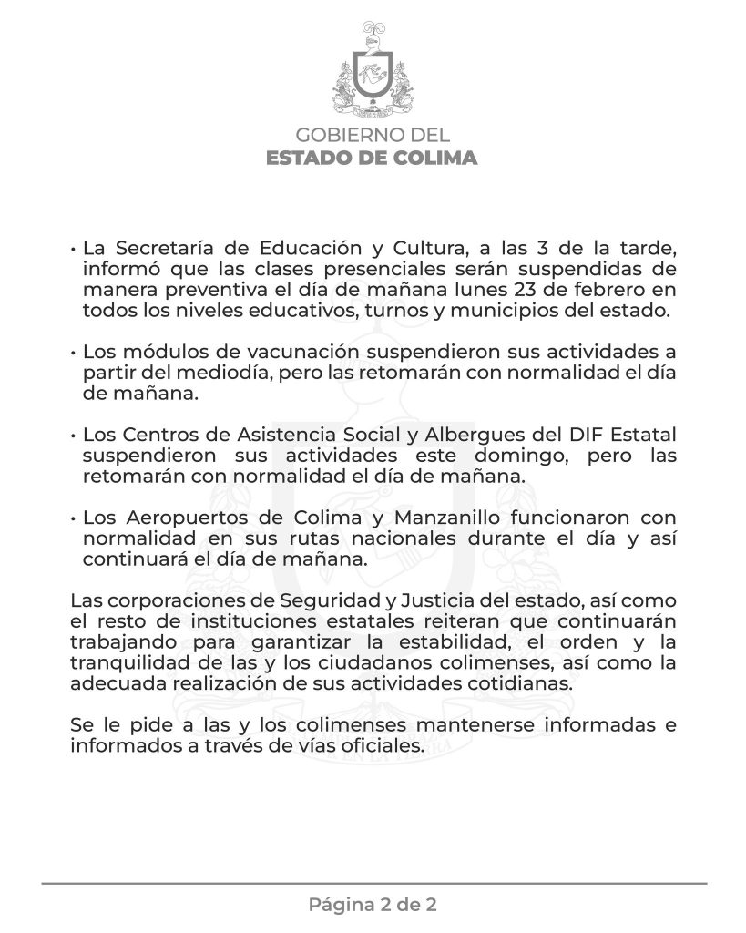 Balance sobre hechos ocurridos en el estado de Colima hoy domingo 22 de febrero