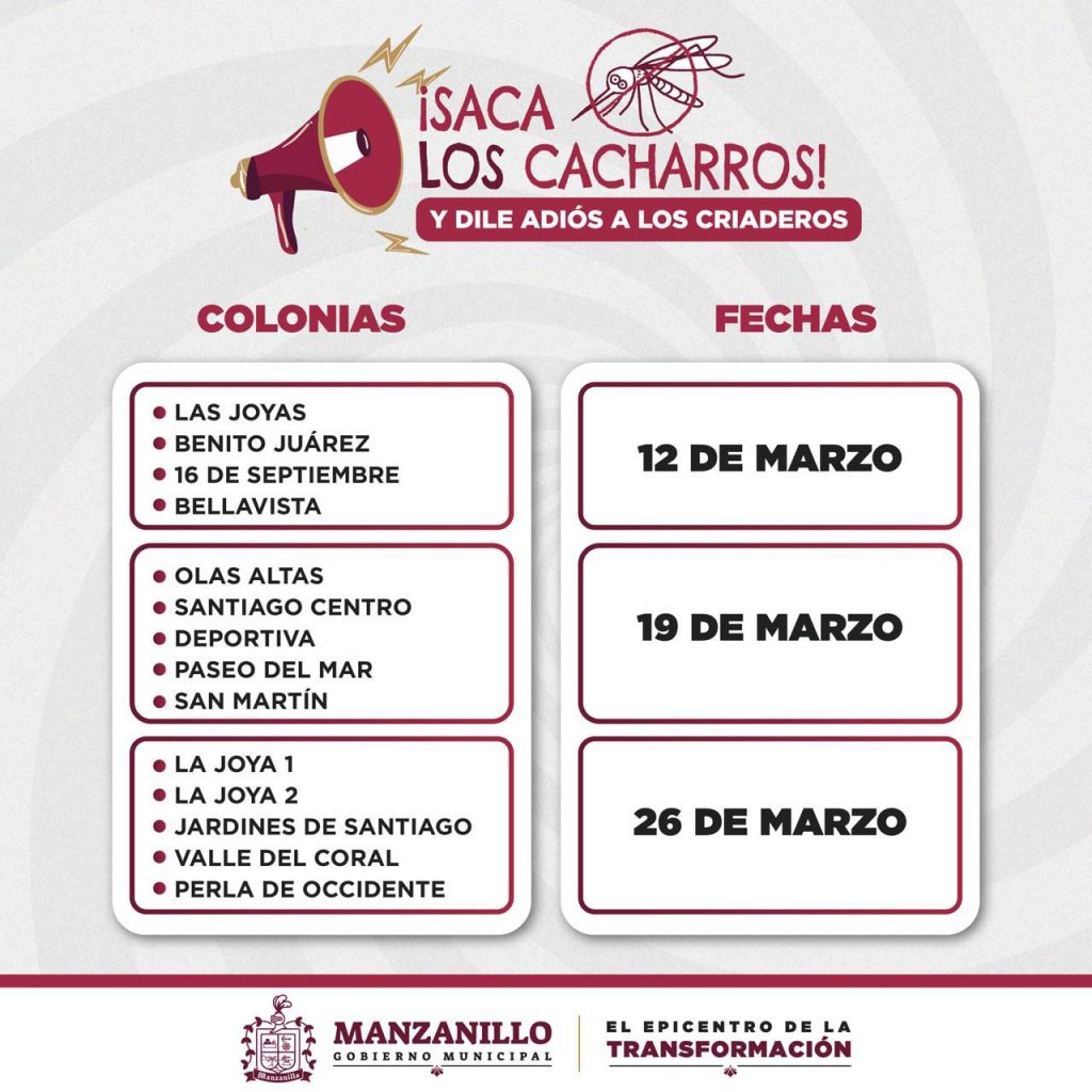 Con el propósito de eliminar criaderos de mosquitos y fortalecer la prevención del dengue, el Gobierno de Manzanillo, encabezado por la presidenta Rosi Bayardo, continuará con las jornadas de descacharrización en distintas colonias del municipio.