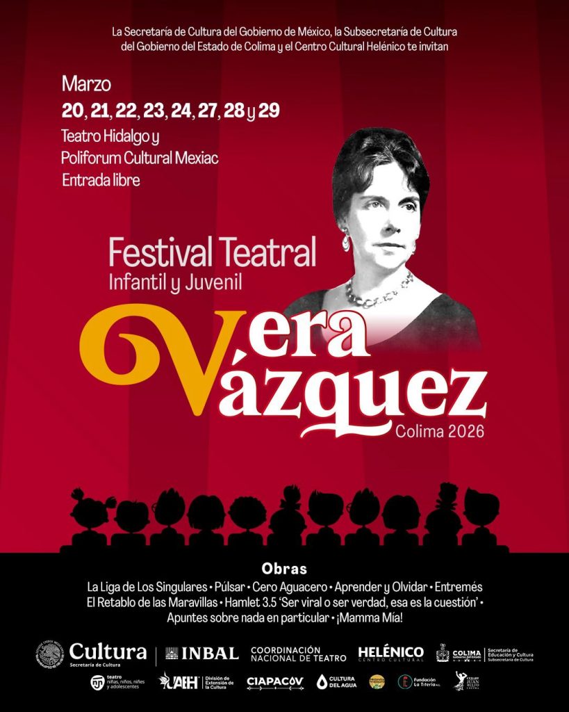 La Subsecretaría de Cultura del Gobierno del Estado de Colima que encabeza la mandataria Indira Vizcaíno Silva celebrará el Día Mundial del Teatro para Infancias y Juventudes, con la primera edición del Festival Teatral Infantil y Juvenil ‘Vera Vázquez’ que del 20 al 29 de marzo ofrecerá ocho funciones gratuitas en el teatro Hidalgo y el Poliforum Cultural Mexiac en el jardín Corregidora, con compañías tanto colimenses como de la Ciudad de México e Hidalgo.
