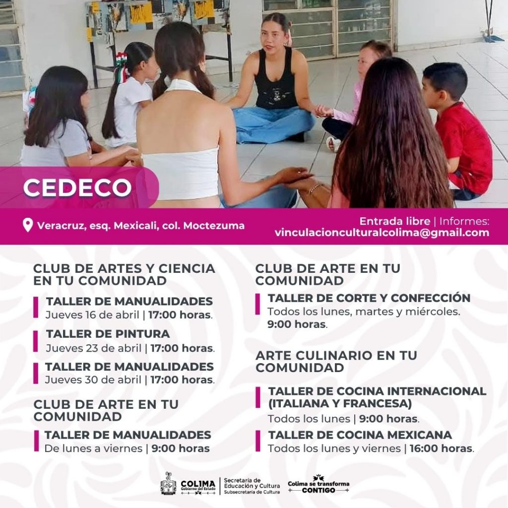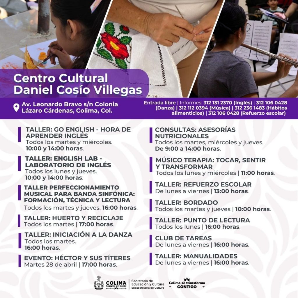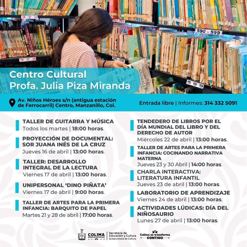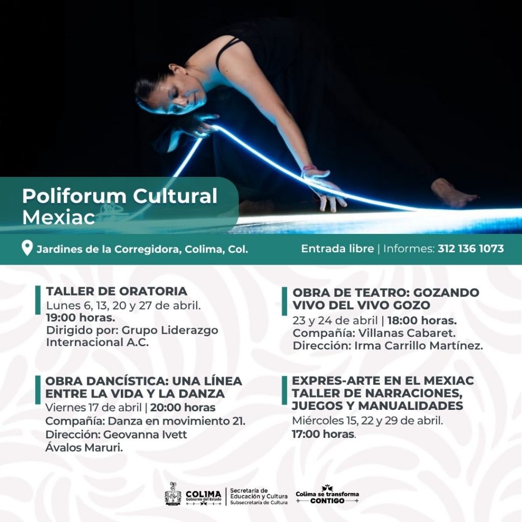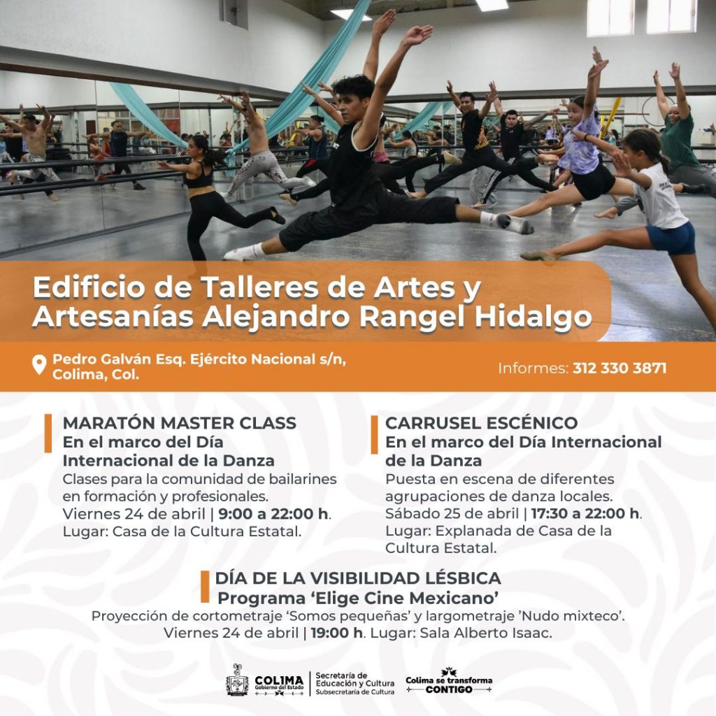 La Subsecretaría de Cultura del Gobierno del Estado de Colima comparte la agenda de abril con más de 70 actividades artístico-culturales, talleres gratuitos, clases magistrales, funciones de teatro, presentaciones dancísticas, conciertos y eventos literarios para todo público, que tendrán lugar en los trece centros y recintos culturales que administra esta dependencia.