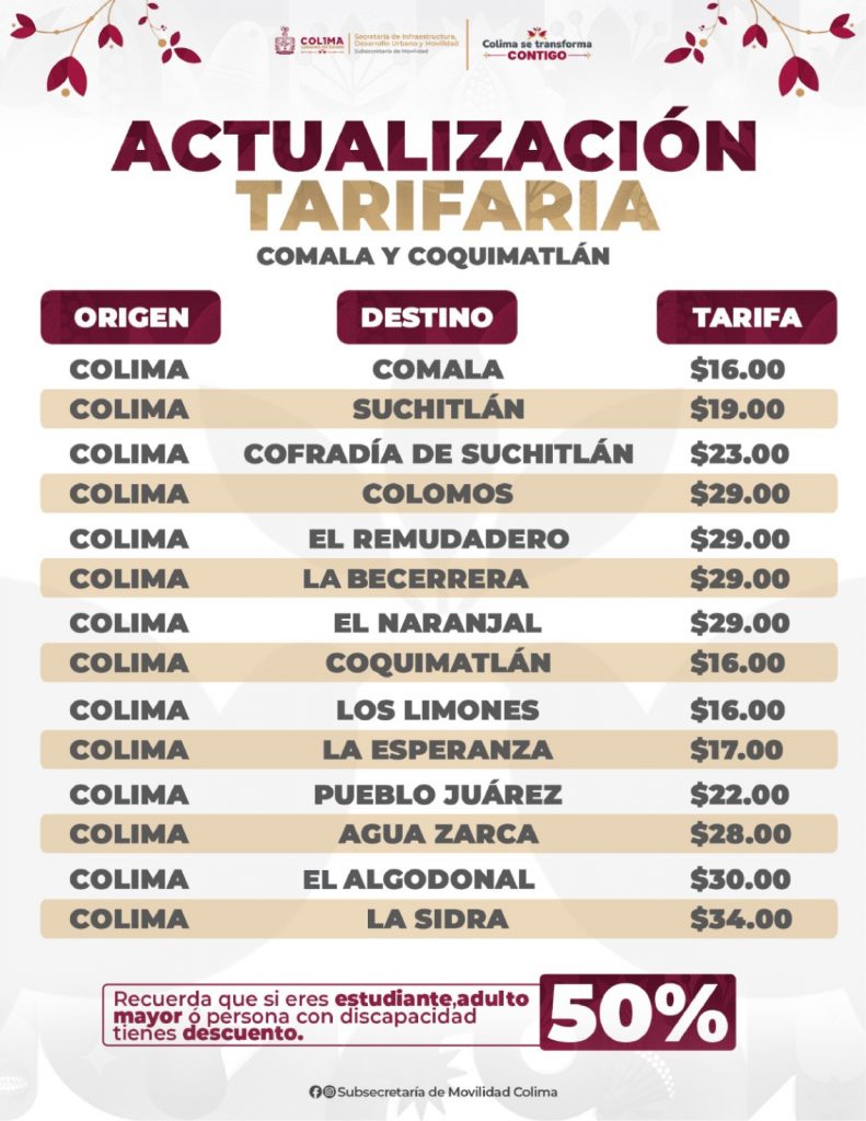 La Subsecretaría de Movilidad (Subsemov) del Gobierno del Estado de Colima dio a conocer en conferencia de prensa acciones prioritarias de su agenda operativa, así como la actualización tarifaria que se informa en gráfico anexo, además del estatus de trámites vehiculares.