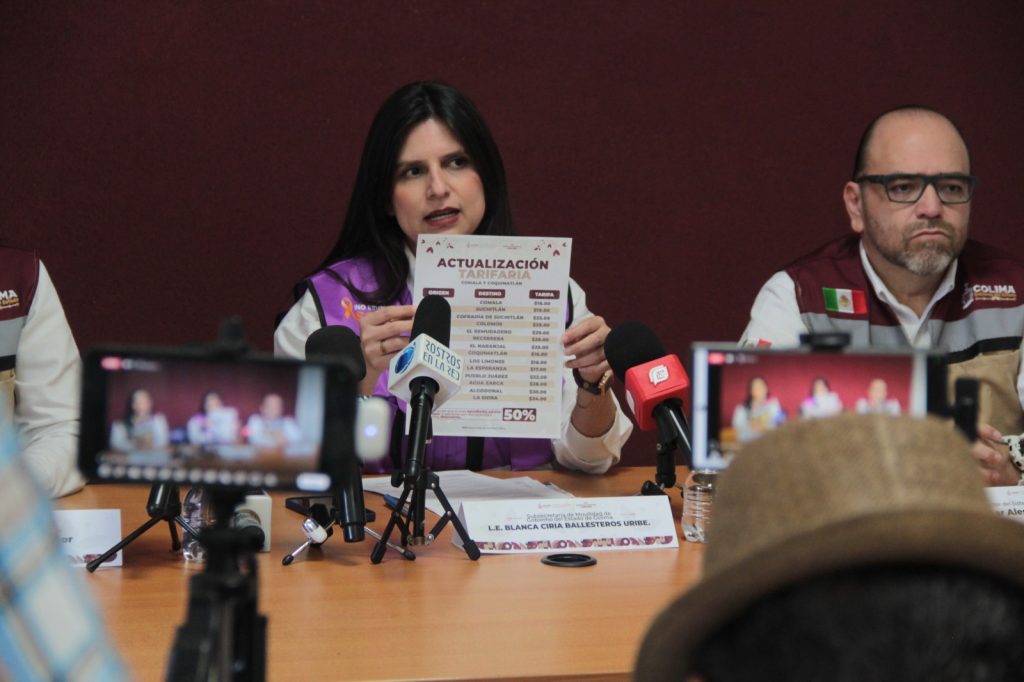 Blanca Ciria Ballesteros Uribe, titular de Subsemov, en compañía de Nayeli Villaseñor, directora de Transporte, y Alessandro Jiménez, director del Sistema Integrado de Movilidad, anunció la actualización de tarifas para las rutas suburbanas de Comala y Coquimatlán, que entrará en vigor el lunes 20 de abril. La actualización no incluye la ruta a Lo de Villa, que se mantiene sin cambios.
